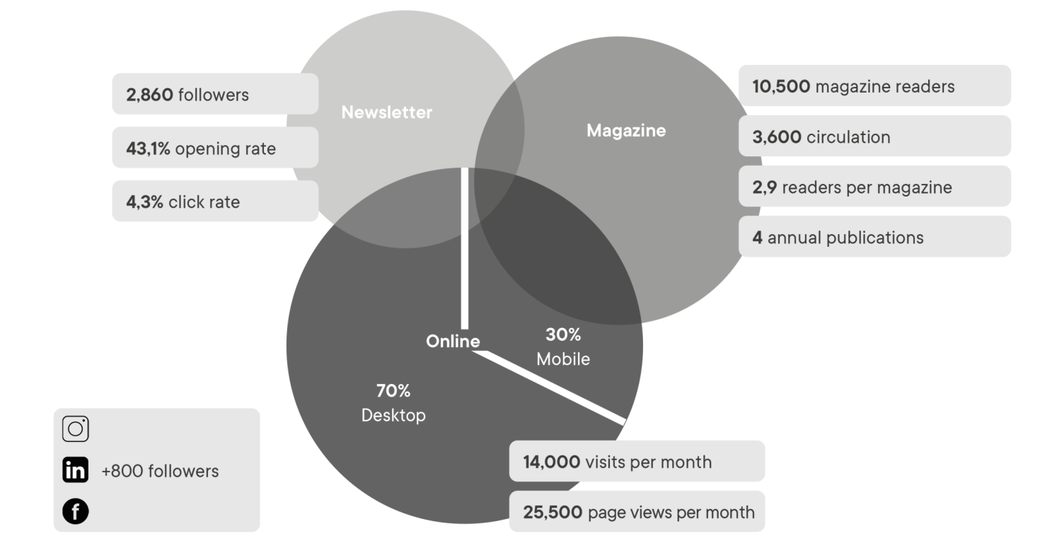 The media platform consists of a print magazine that is published 4 times a year, an online portal, and a weekly newsletter that is sent every Wednesday. In addition, regular themed newsletters are sent where relevant agendas are unfolded.